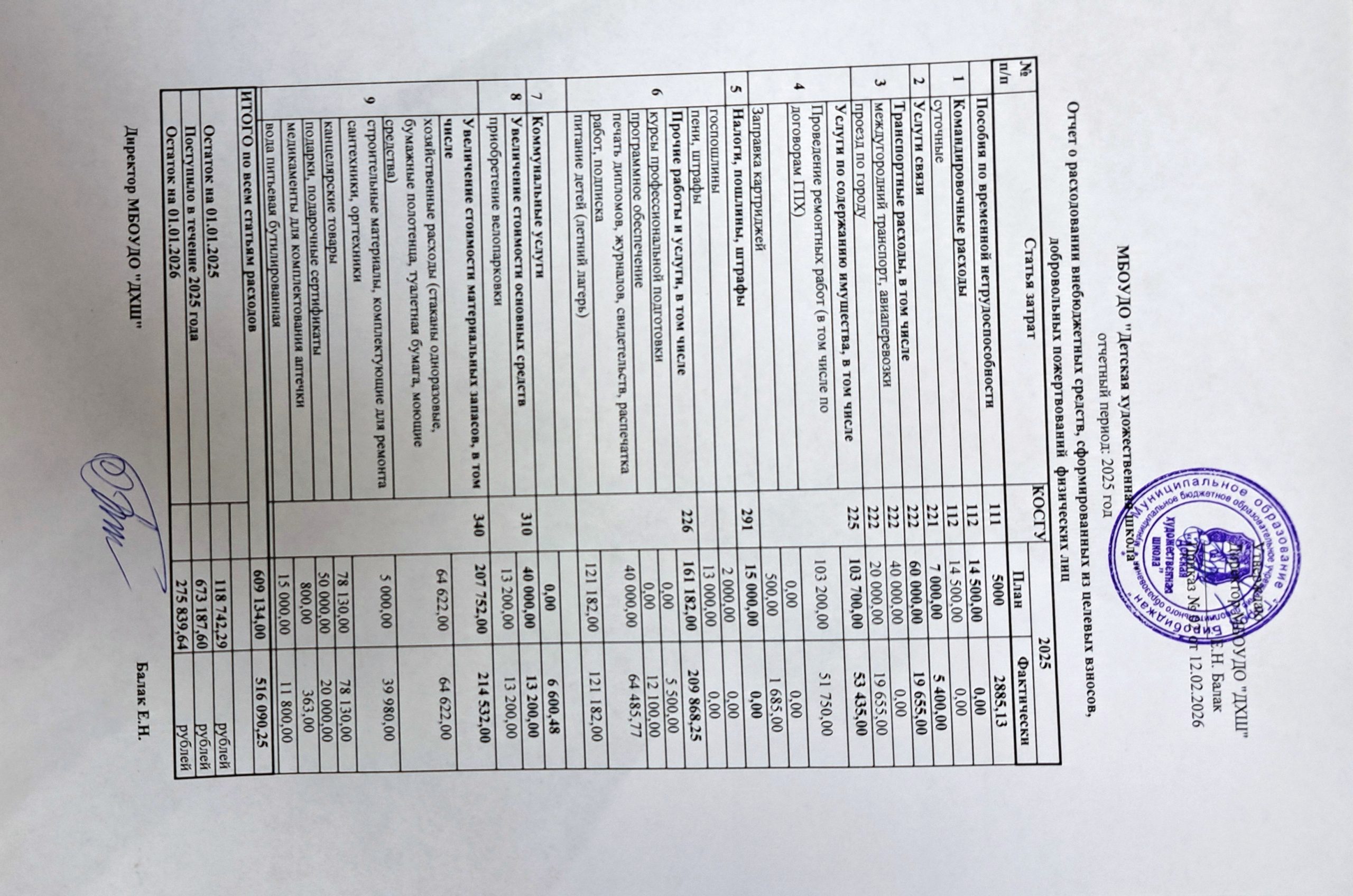 Отчет о расходовании внебюджетных средств, сформированных из целевых взносов, добровольных пожертвований физических лиц 2025 год